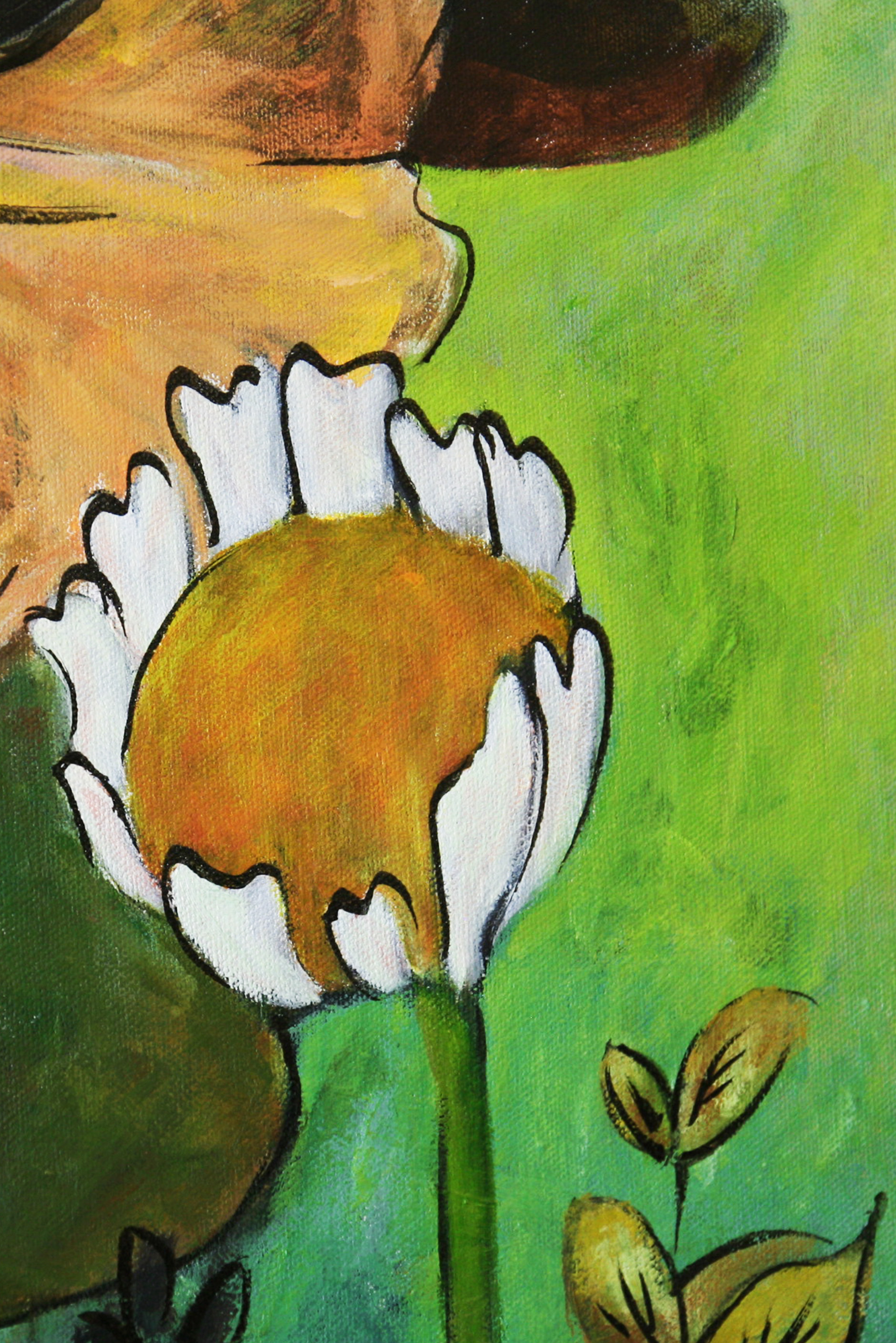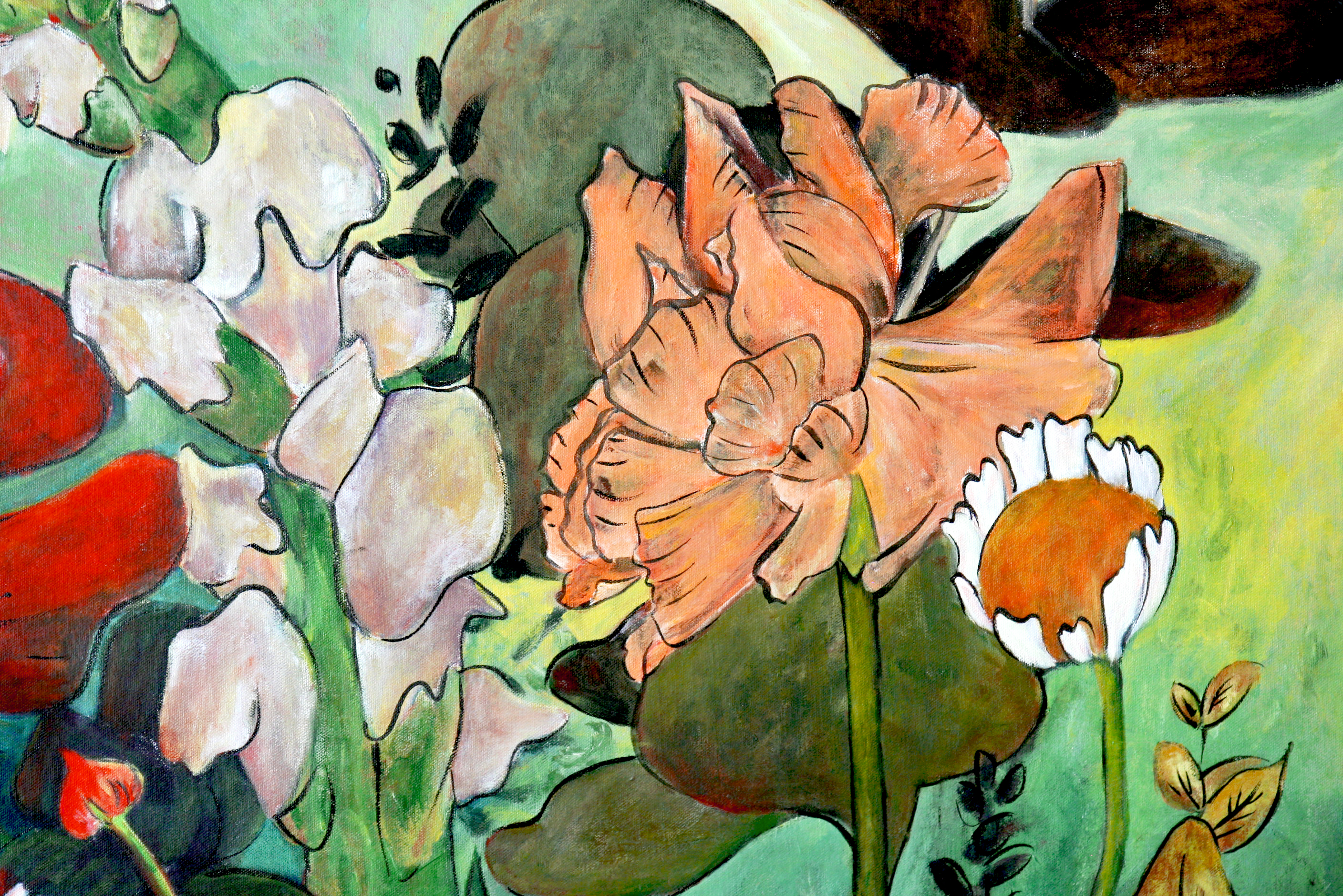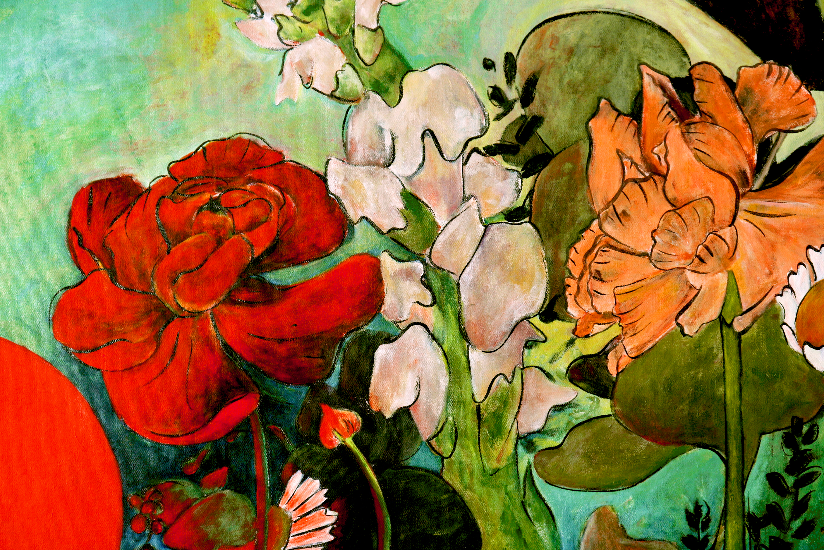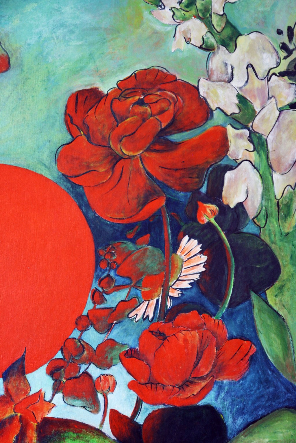 Sara’s expressive palette—anchored in earthy greens, vibrant reds, and the bold presence of a sun-like red circle—creates a visual language that is both symbolic and deeply sensory. Each flower, leaf, and abstract gesture feels intentionally placed yet instinctively rendered, reflecting her grounding in sumi-e discipline and the influence of modernist expression.